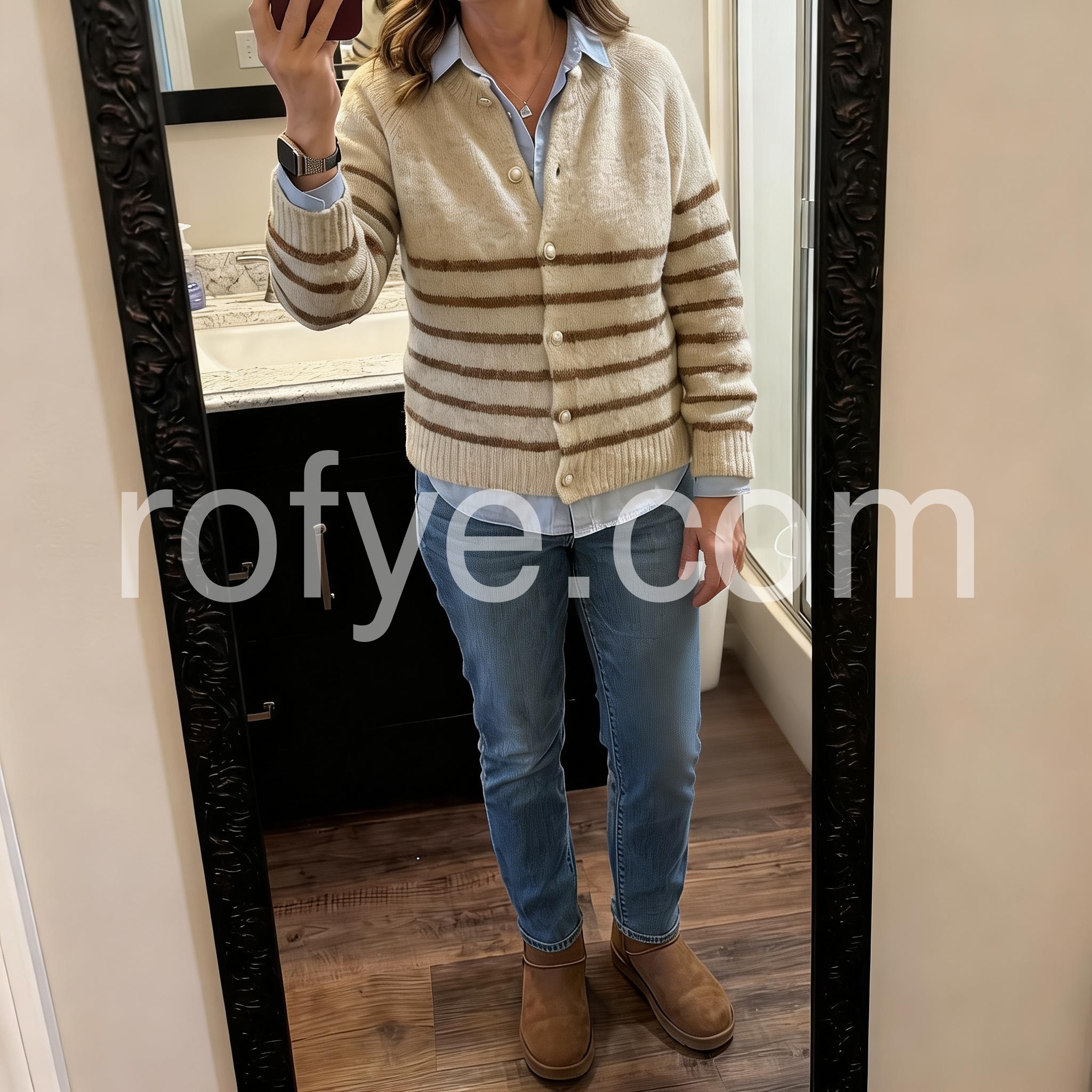 This Apricot Long Sleeve Striped Cardigan is a versatile addition to any wardrobe. Perfect for cooler days, it features a timeless striped design and long sleeves for added warmth. Made from high-quality materials, it's both comfortable and stylish, making it the perfect option for everyday wear. With its classic design and practical features, this cardigan is a must-have for any fashion-forward individual.