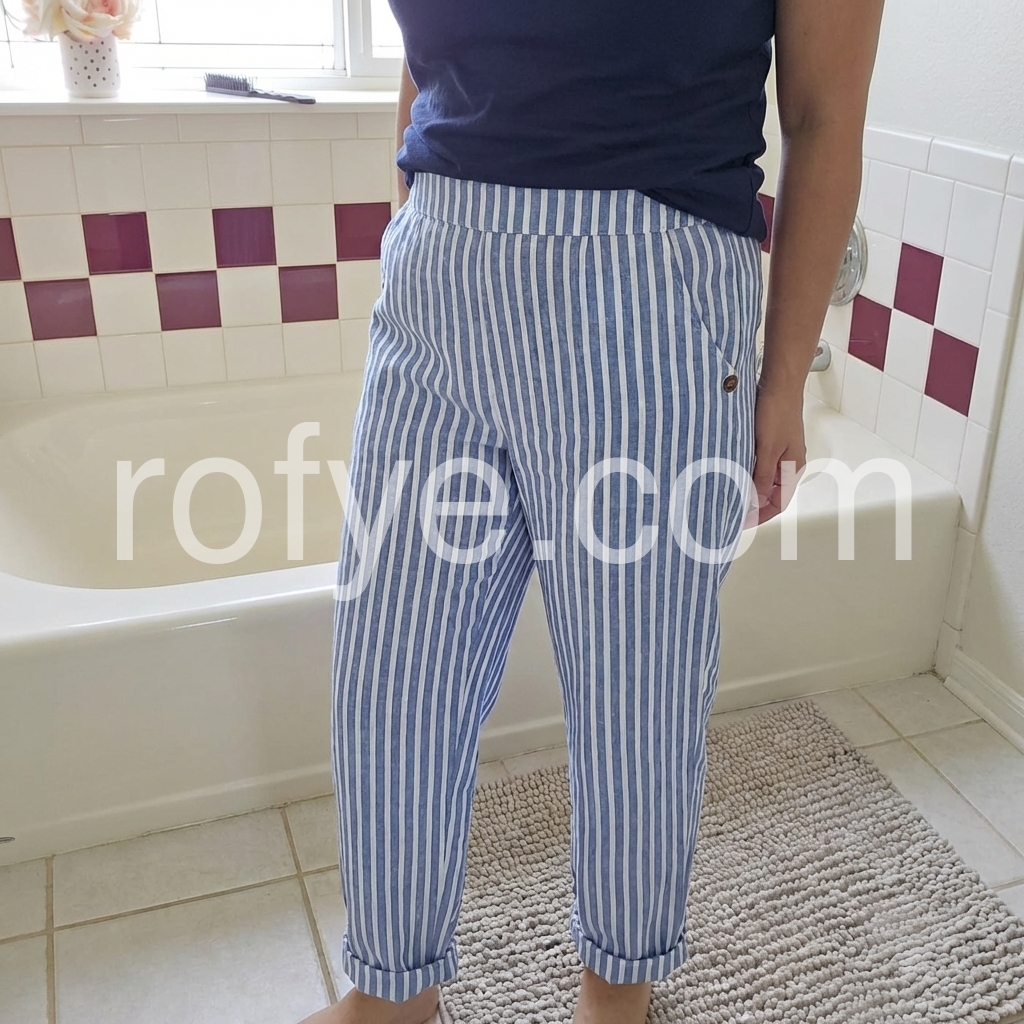 These relaxed-fit pants feature vertical blue and white stripes with a casual, breezy silhouette. Elastic waistband and side pockets for comfort. Cuffed hems add a stylish touch. Perfect for beach days or everyday wear. Lightweight fabric ideal for warm weather.