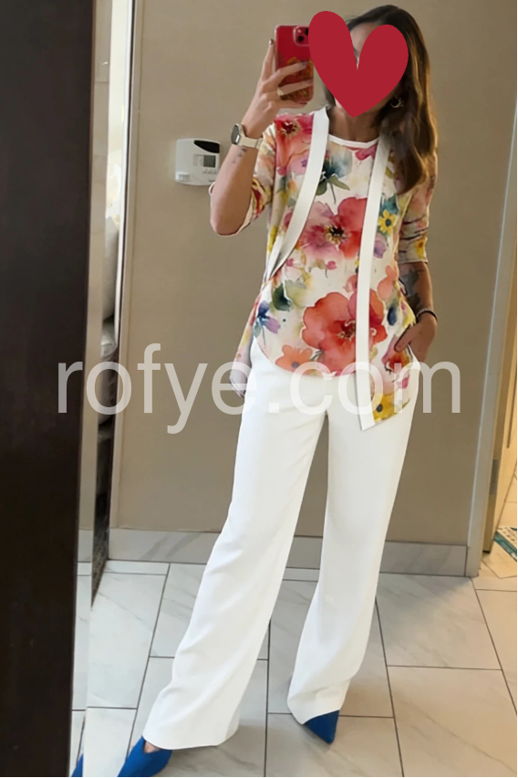 This three-piece set features a vibrant floral top and matching cardigan with white wide-leg pants. The relaxed fit offers comfort and elegance. Perfect for spring or summer occasions. Lightweight fabric ideal for casual outings. Effortlessly chic and coordinated.