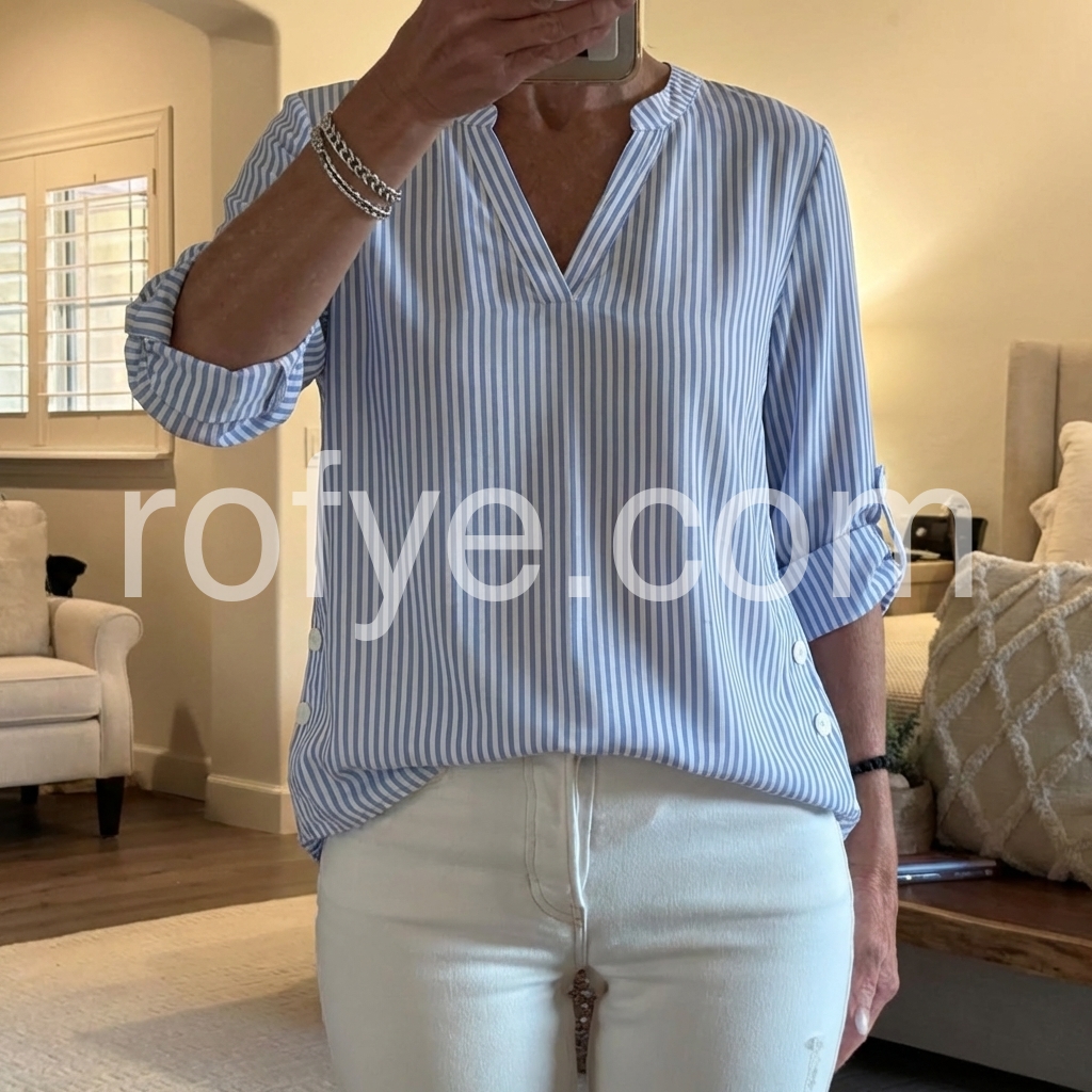 This elegant top features vertical blue and white stripes with a soft V-neckline. Side buttons add a stylish detail. Three-quarter sleeves with rolled cuffs for comfort. Lightweight fabric perfect for casual or office wear. Effortlessly chic and breathable.