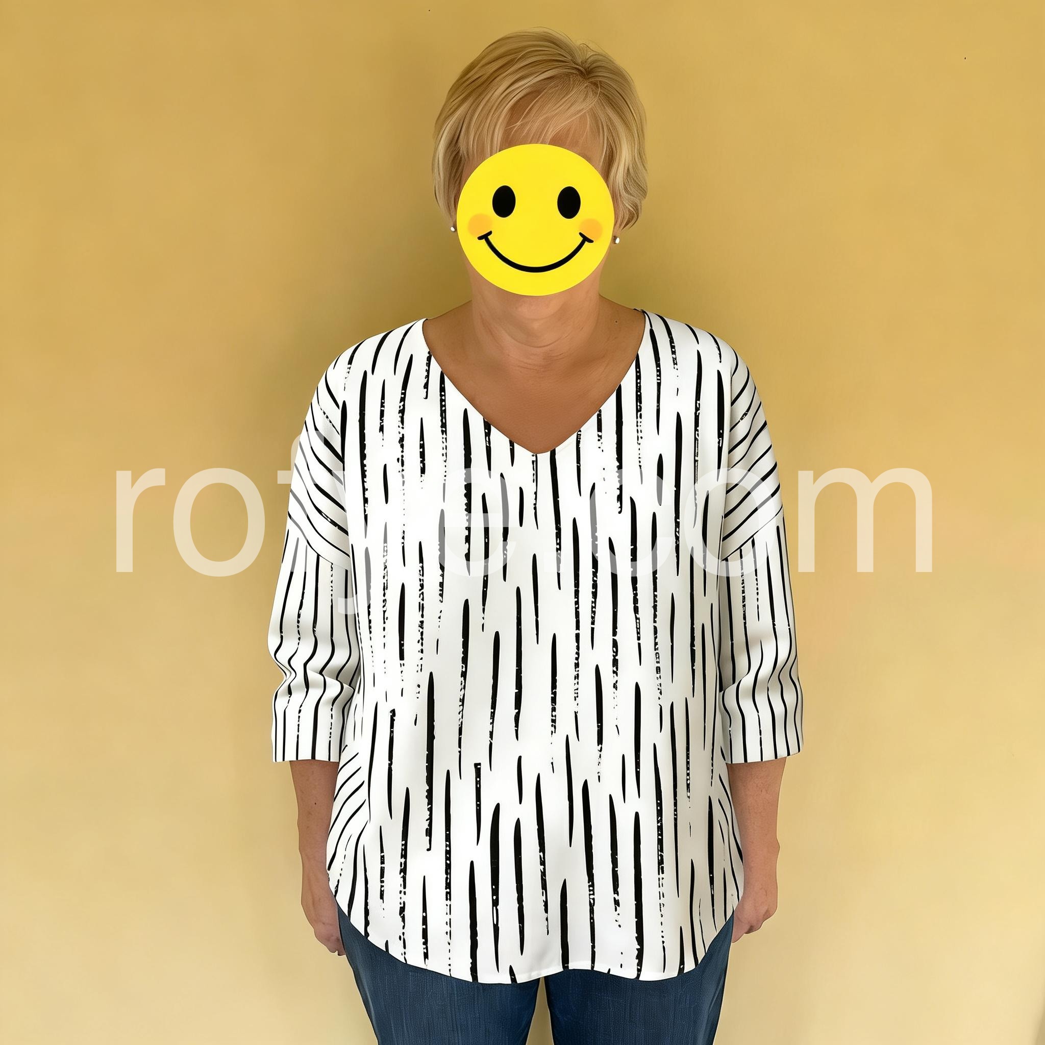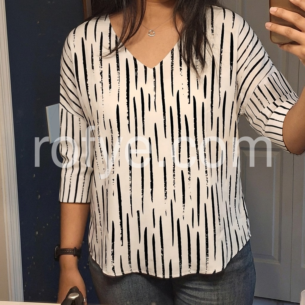This loose-fit blouse features a bold black abstract stripe print on a white base. Deep V-neckline and three-quarter sleeves with rolled cuffs. Lightweight fabric for comfort and style. Perfect for casual wear or relaxed outings. Stylish and easy to pair with jeans or pants.