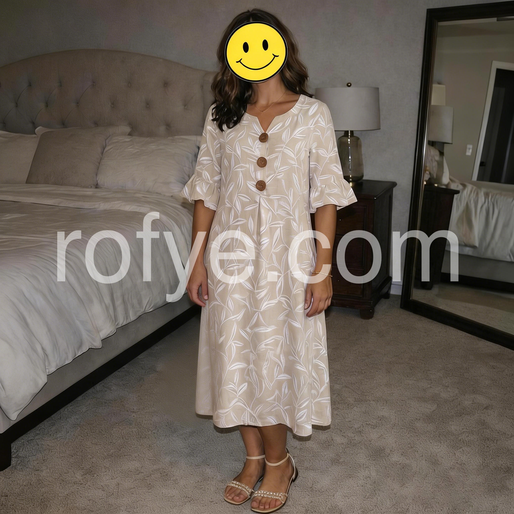 This flowy midi dress features a soft beige base with white leaf patterns. V-neckline with wooden buttons and flared sleeves for a relaxed look. Lightweight fabric perfect for warm weather. Ideal for beach outings or casual days. Effortlessly stylish and comfortable.