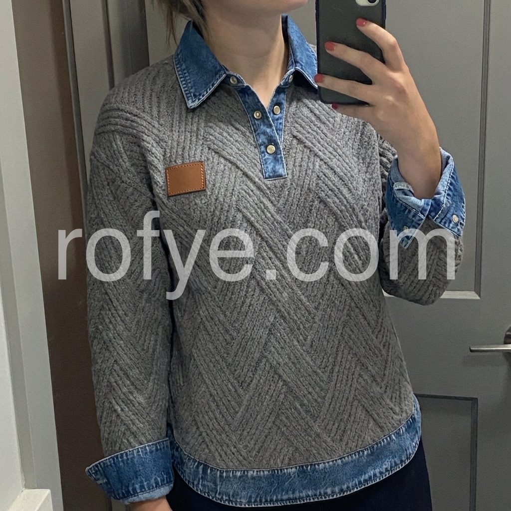 Elevate your casual wardrobe with this sophisticated grey herringbone knit sweater, featuring a distinctive denim collar that bridges the gap between refined knitwear and relaxed styling. The herringbone texture adds visual depth and dimension, while the contrasting denim collar provides a contemporary edge perfect for layering or wearing standalone. Crafted for versatility, this piece transitions seamlessly from weekend wear to smart-casual settings, offering both comfort and polished appeal.