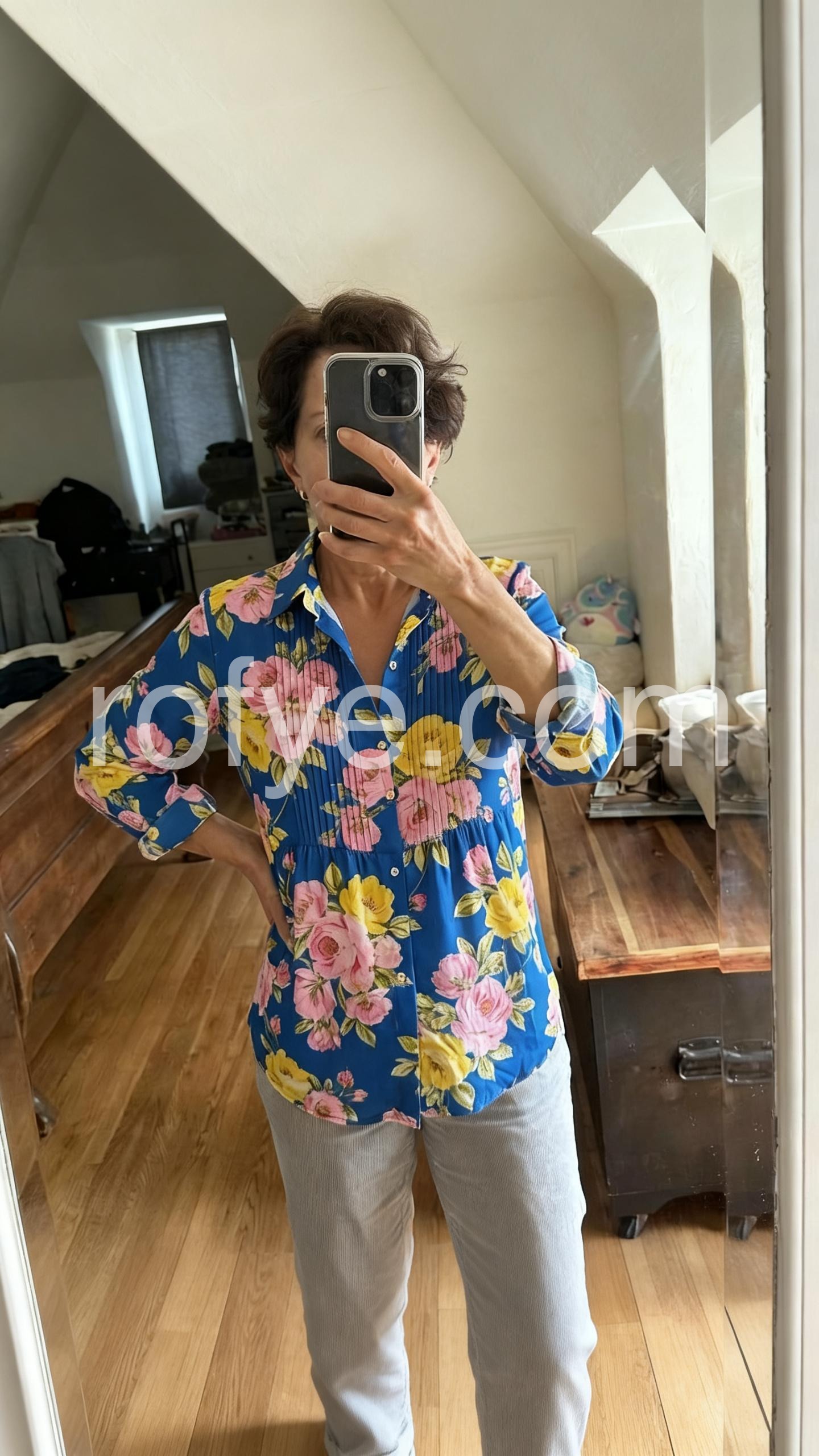 Trendy Blue Floral Pleated Shirt