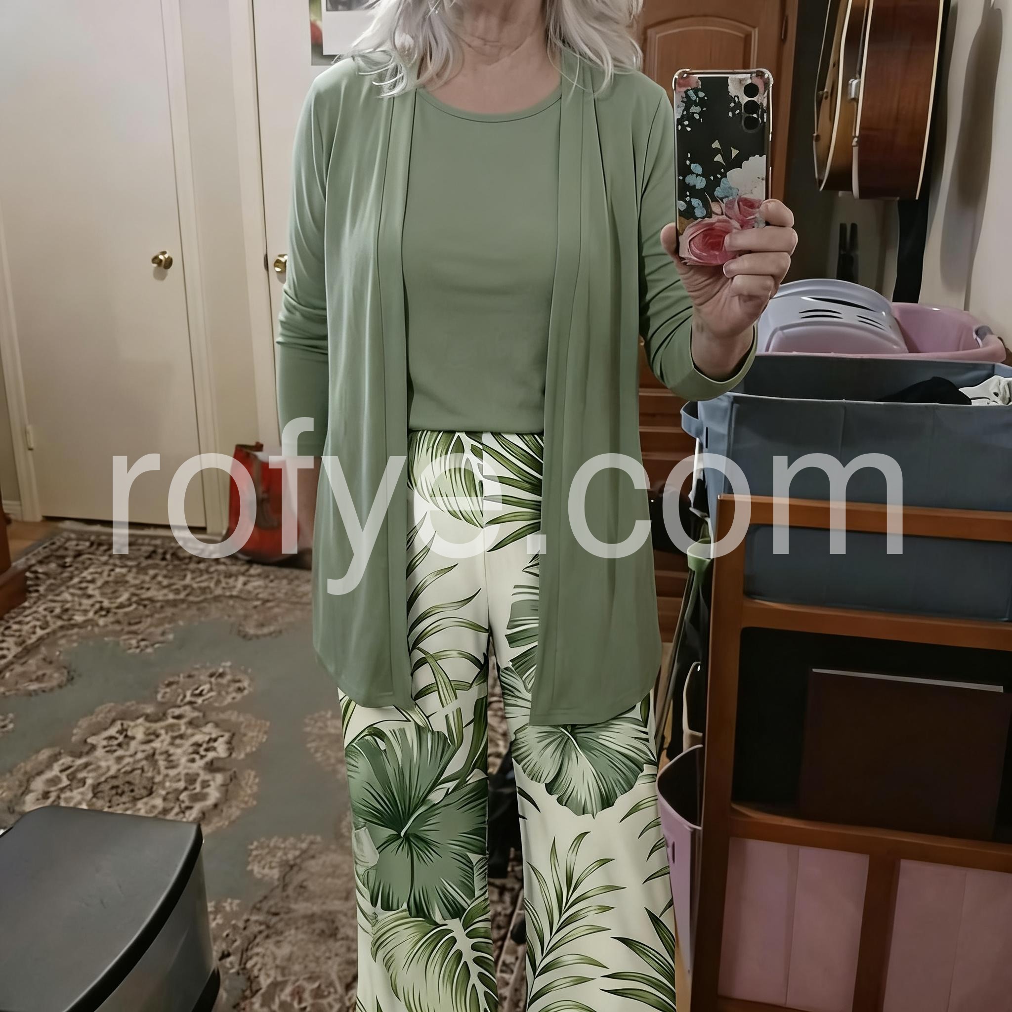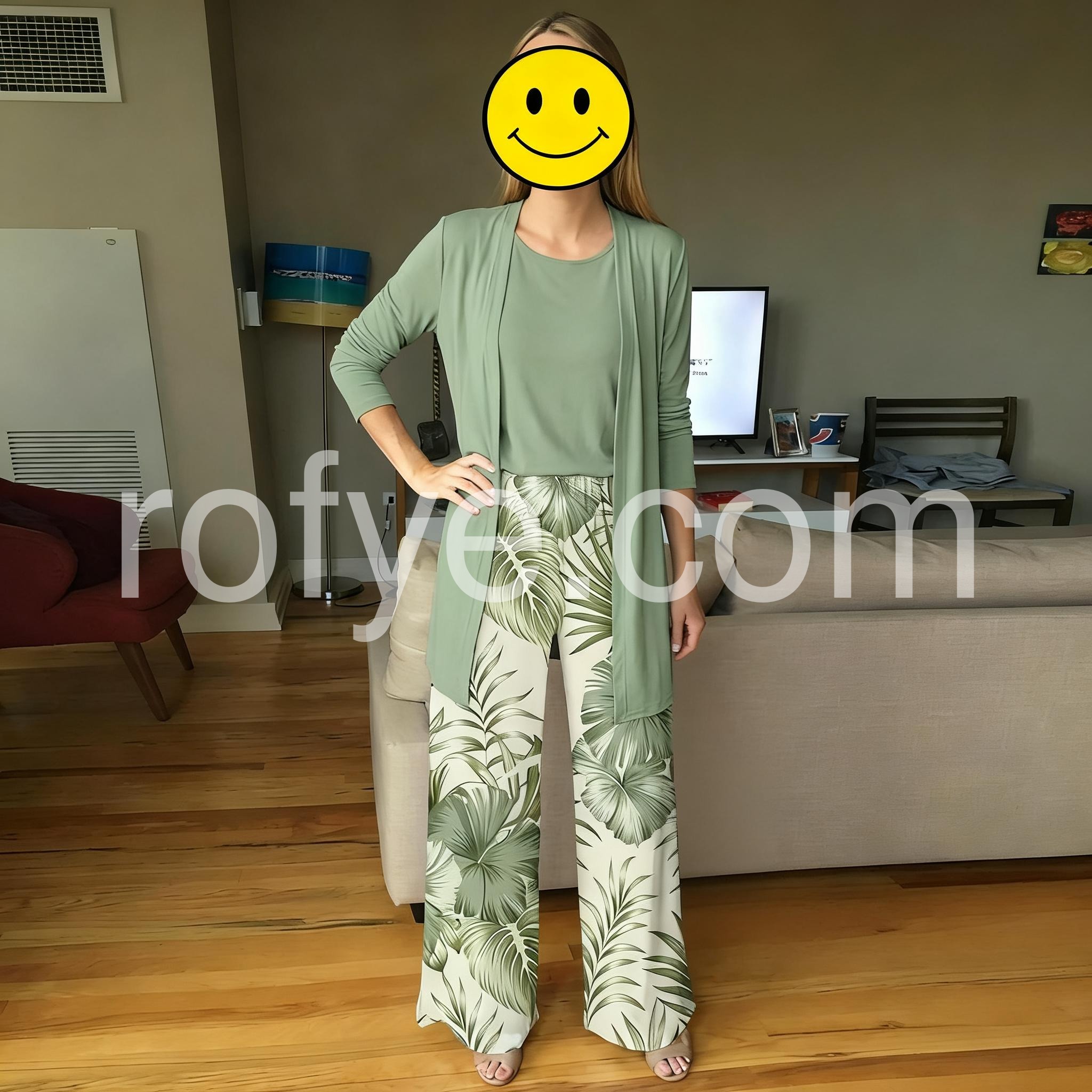 This three-piece set features a soft sage green drape cardigan with a relaxed fit. Paired with wide-leg pants in a leafy tropical print for a fresh, nature-inspired look. Lightweight fabric ensures comfort and breathability. Ideal for casual outings or warm-weather days. Effortlessly chic with a touch of boho elegance.