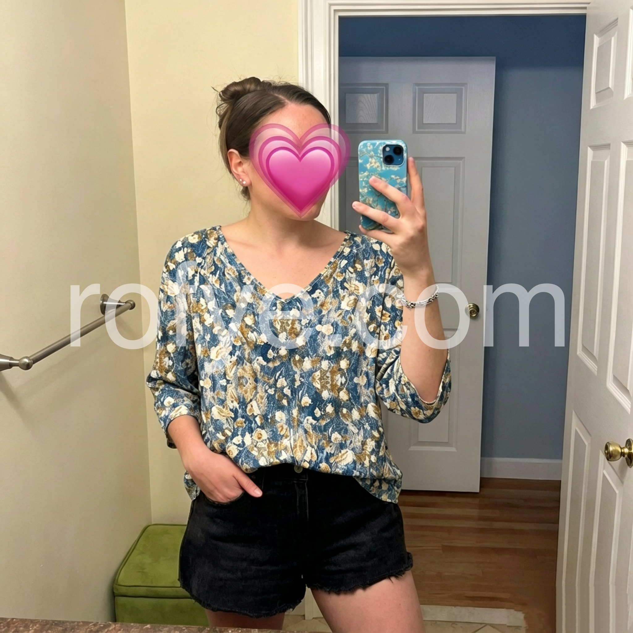 Style# 1548415As a designer, I created this blouse to solve the “neutral yet interesting” styling dilemma. The muted blue and gold floral print feels vintage-inspired and sophisticated, while the relaxed dolman sleeves and loose fit offer maximum comfort. The V-neckline elongates the silhouette, balancing the wide sleeves and keeping the look modern.