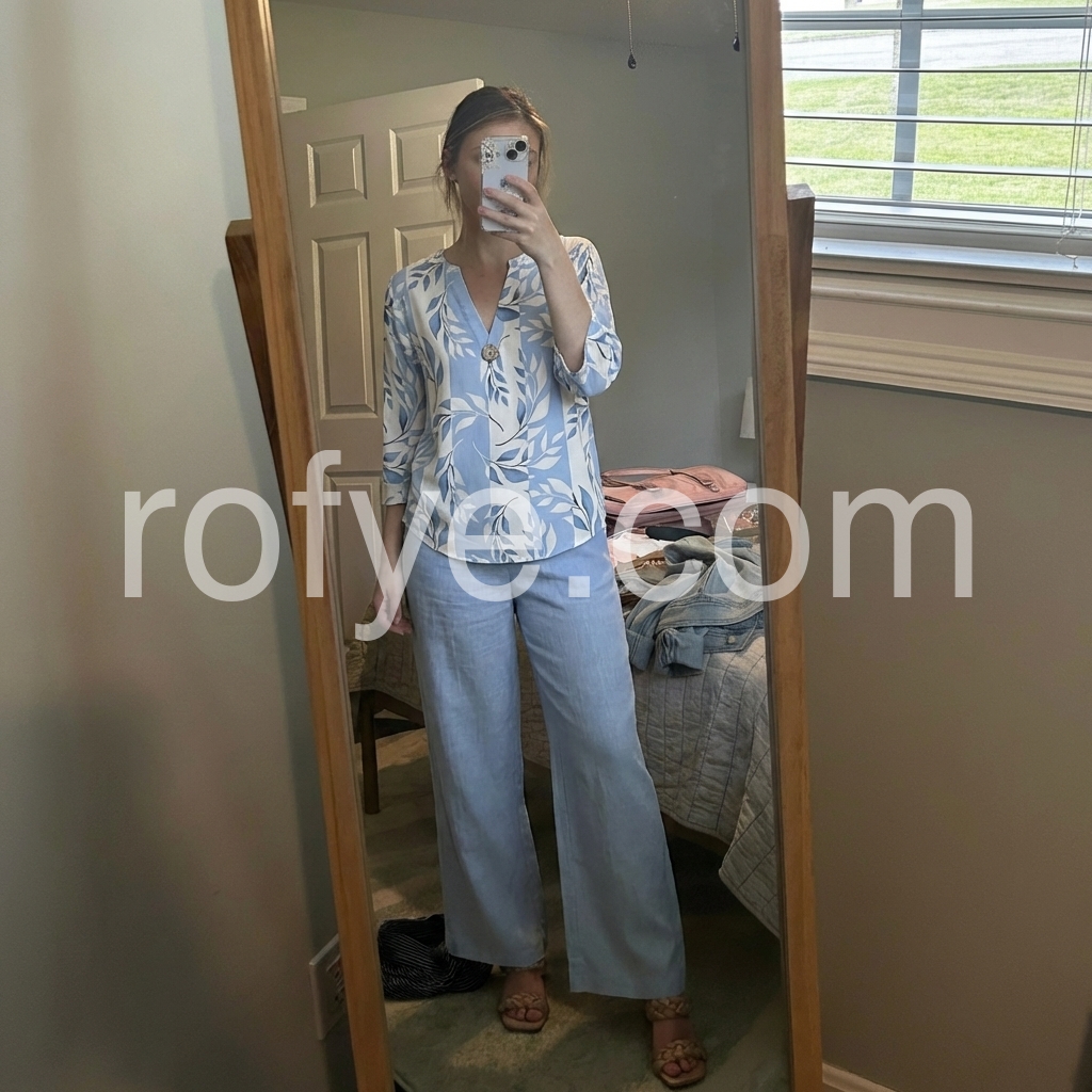 Hey fashionistas! This two-piece set is a total game-changer. The V-neck top with blue and white prints is super flattering, while the three-quarter sleeves add a touch of elegance.