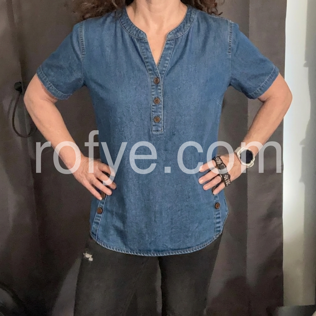 This denim-inspired top features a soft, textured fabric with subtle embossed patterns for added depth. The short sleeves and V-neckline with button detailing create a classic, flattering look. Side buttons add a unique touch and enhance the relaxed silhouette. Perfect for casual days or layered outfits. Pair with jeans or white pants for a fresh, effortless style.