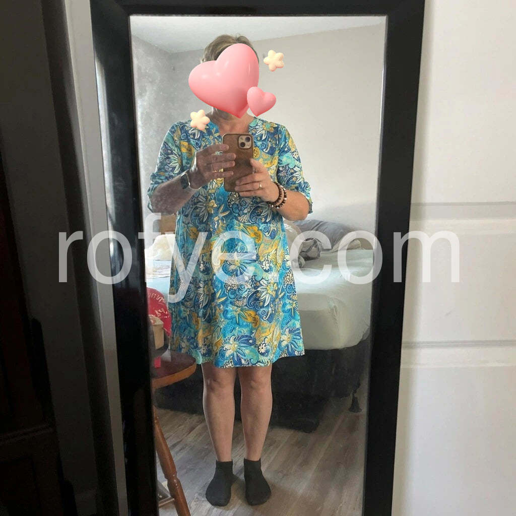 This cheerful and eye-catching summer dress features a bold, tropical-inspired floral print in vivid shades of blue, yellow, and white, creating a lively and festive look perfect for warm weather. Designed with a flattering V-neckline and short sleeves that roll up at the cuffs, it offers both style and comfort. The loose, A-line cut flows gracefully over the body, making it ideal for casual outings, beach days, or vacation adventures. Made from lightweight, breathable fabric, this dress ensures coolness and ease of movement. Pair it with sandals, a straw bag, and sunglasses for a complete bohemian-chic ensemble. Whether you're strolling through the city or relaxing by the sea, this dress brings vibrant energy and effortless charm to any summer wardrobe.