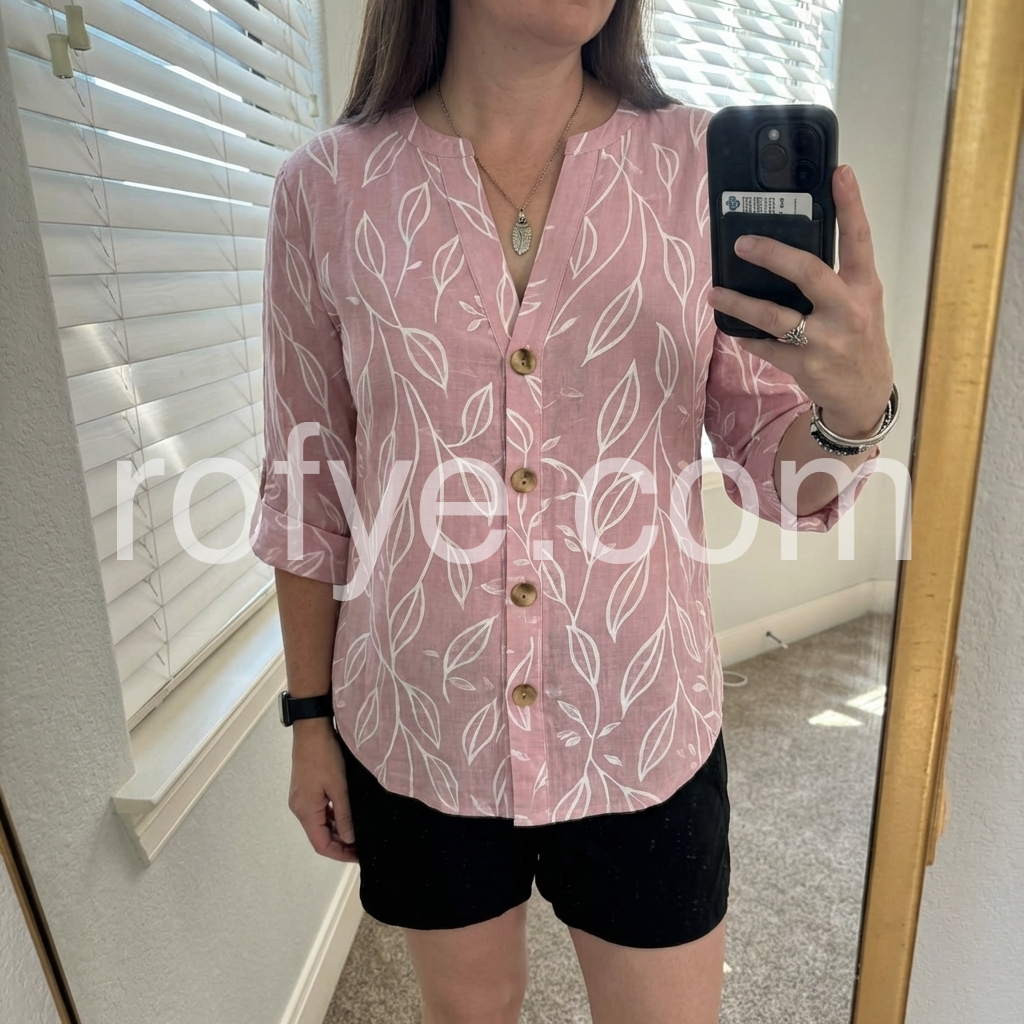 I designed this blouse to bring soft, bohemian charm to everyday wear. The delicate leaf print on muted pink feels fresh and romantic, while the notched V-neck adds a modern touch.