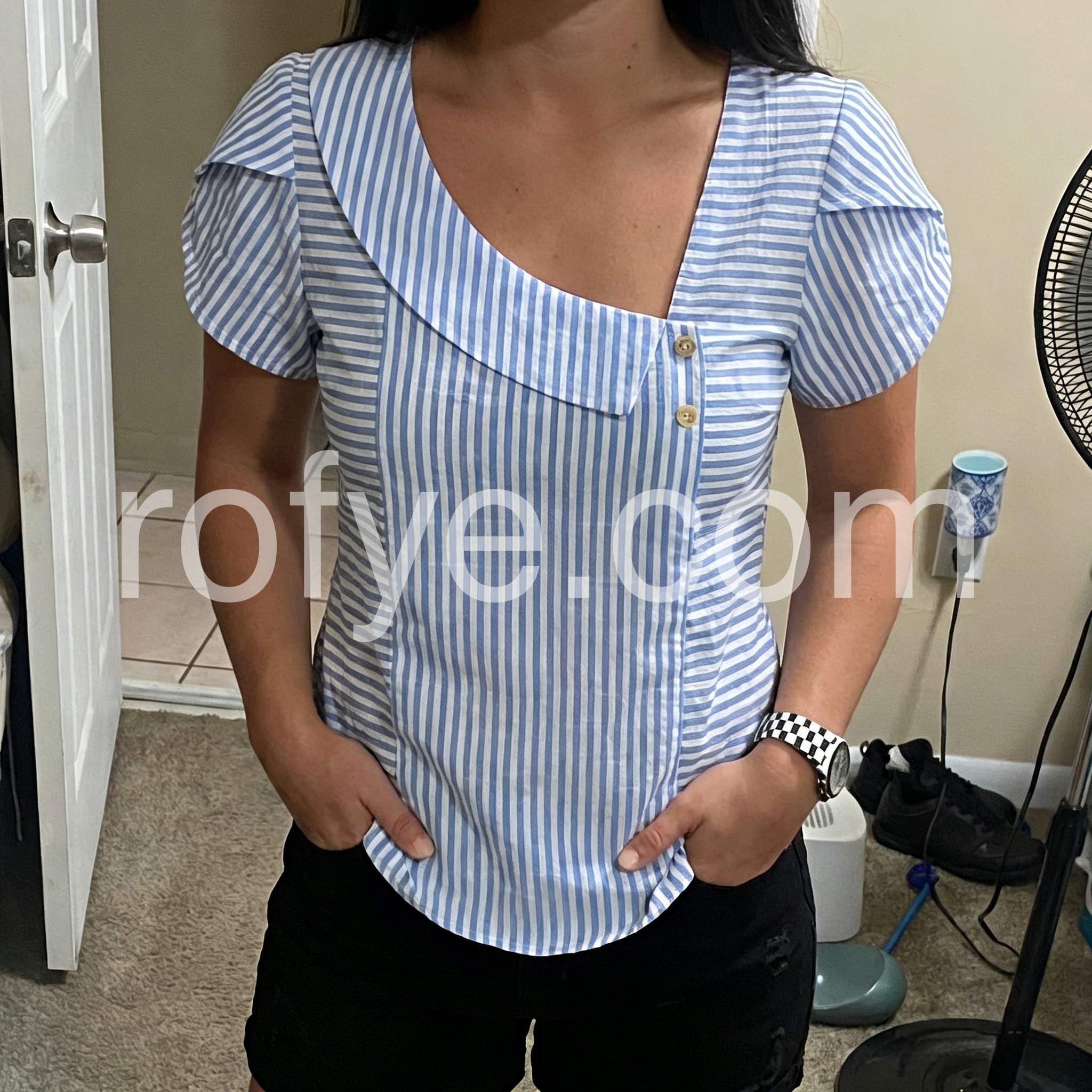 This blouse reimagines classic stripes with a bold, modern twist. The asymmetrical neckline, puff sleeves, and button detail create a unique, fashion-forward silhouette.