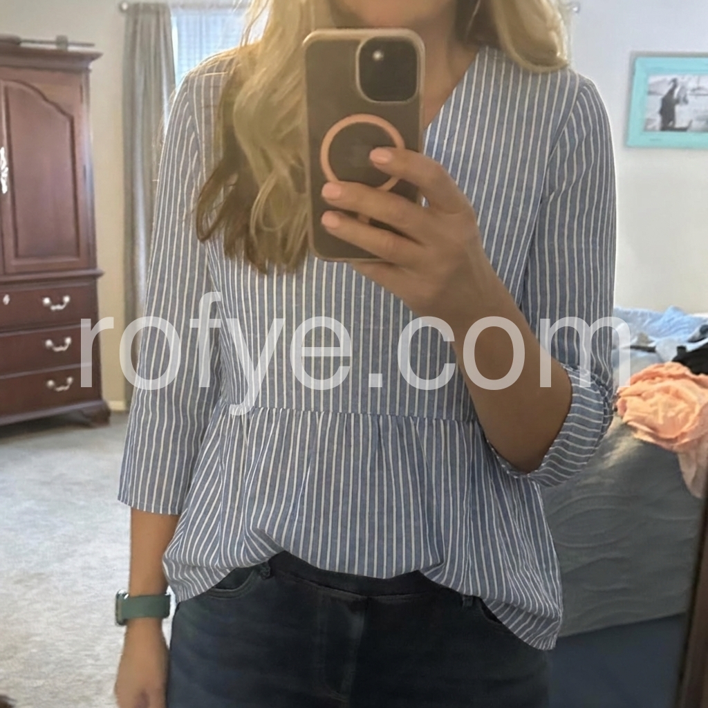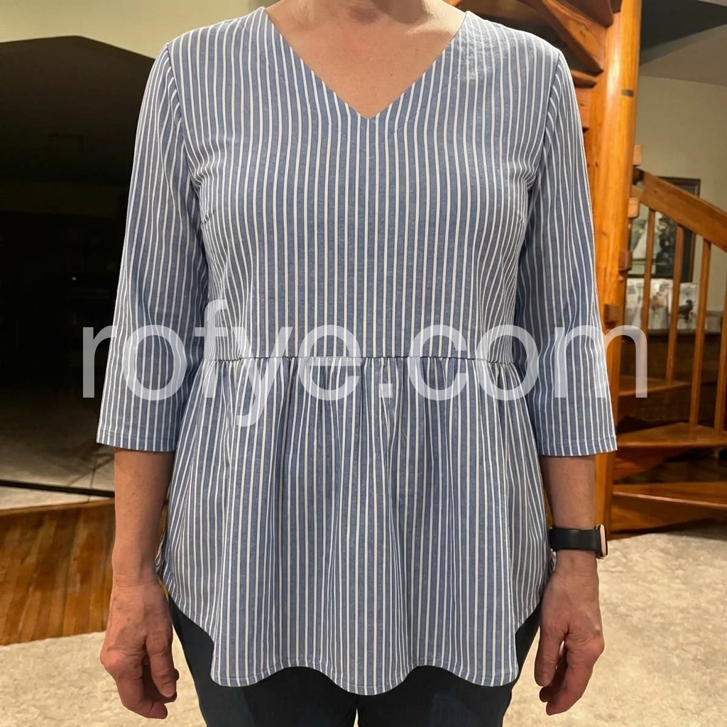 This relaxed-fit tunic features vertical blue and white stripes with a soft V-neckline. Three-quarter sleeves with rolled cuffs for a casual look. Gathered waist creates a flattering silhouette. Lightweight fabric perfect for everyday wear. Ideal for pairing with jeans or leggings.