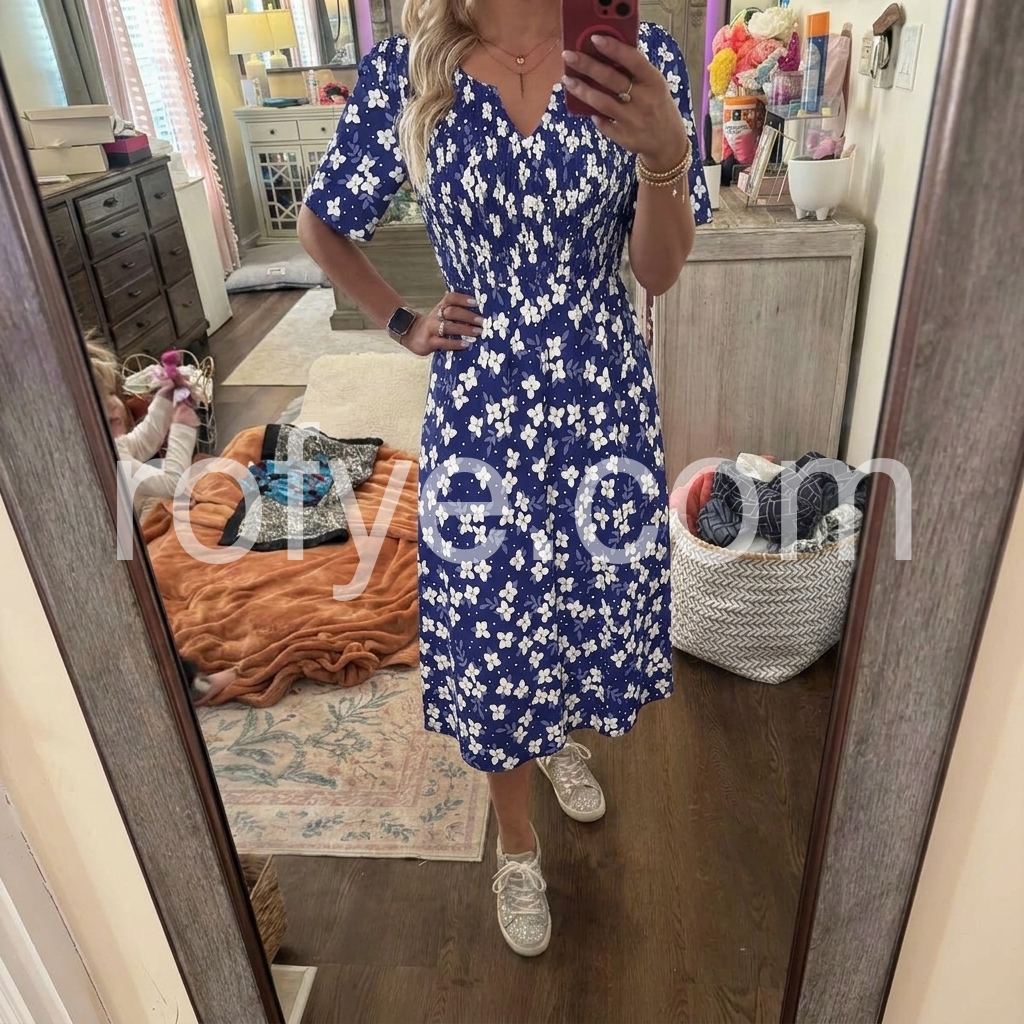 This dress solves the “cute but comfortable” dilemma with ease. The ditsy white floral print on a navy base feels fresh and summery, while the smocked waist creates a flattering silhouette. The gathered detail cinches the waist without feeling tight.