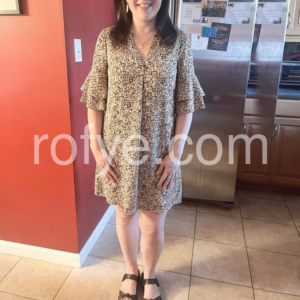 The V-neck, double-layered ruffle sleeves, and relaxed fit create a flowing, feminine silhouette.