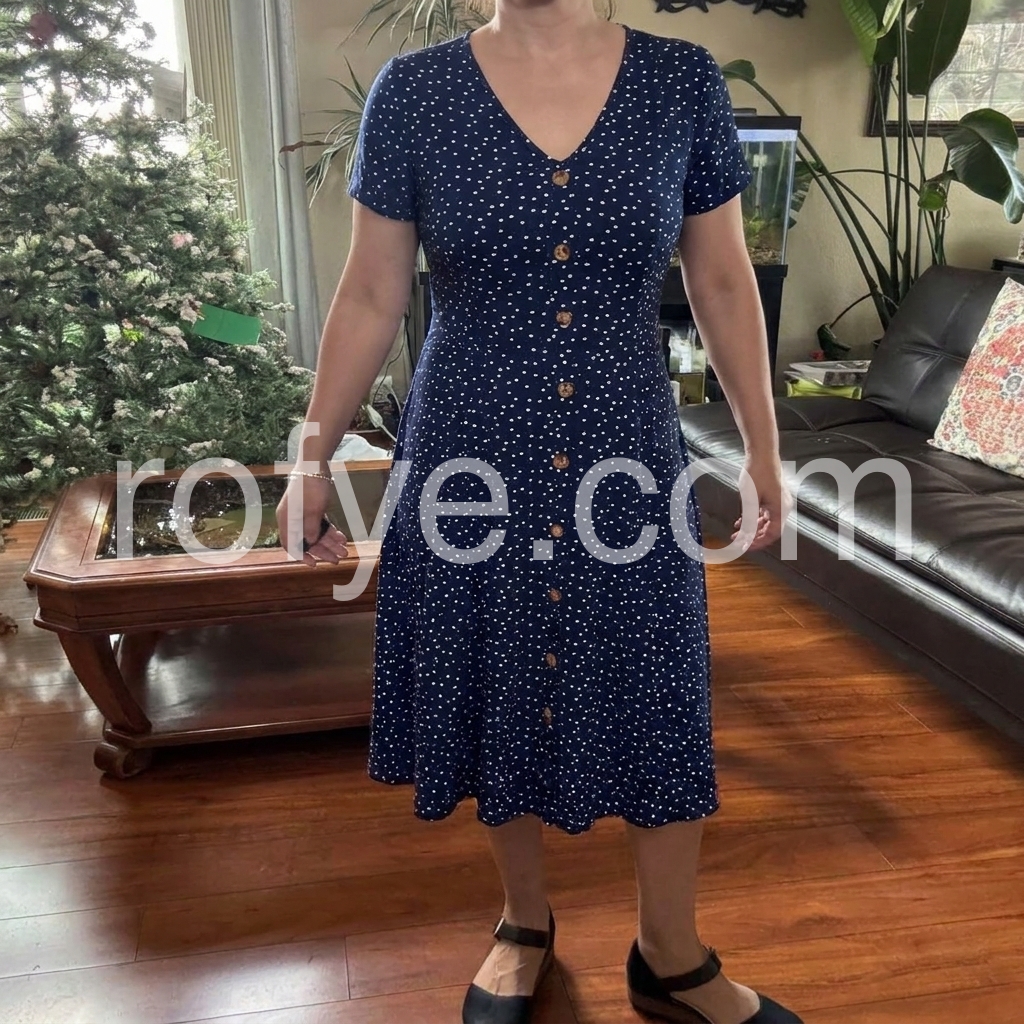 Navy Polka Dot Button-Front V-Neck Midi Dress