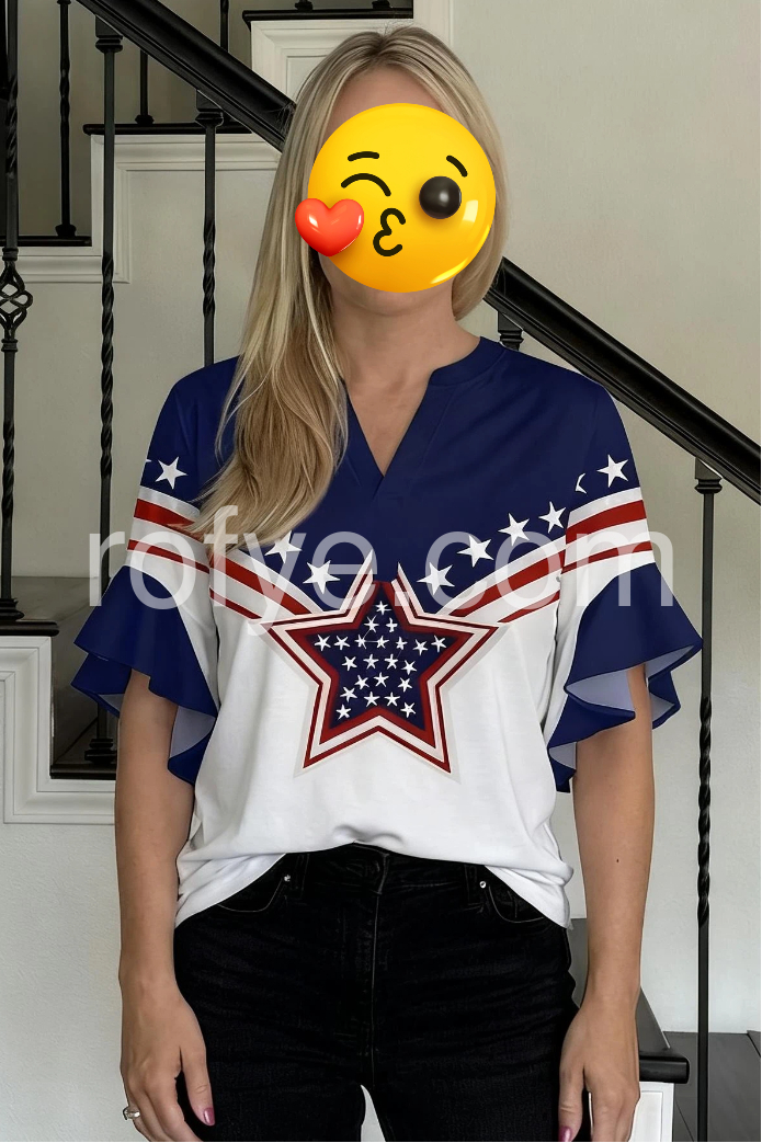 This V-neck top features a bold American flag-inspired design with red, white, and blue stars. The ruffled sleeves add a feminine flair. Loose fit for comfort and ease. Perfect for 4th of July or patriotic events. Ideal for casual summer wear.