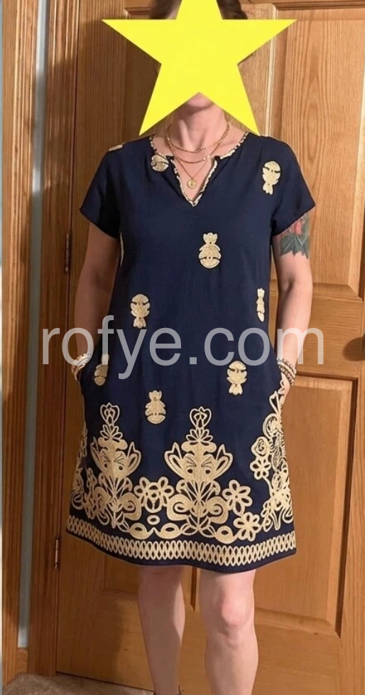 Slip into summer bohemia with this stunning navy shift dress. It features intricate cream embroidery and a relaxed V-neck fit, blending artisanal charm with everyday ease.