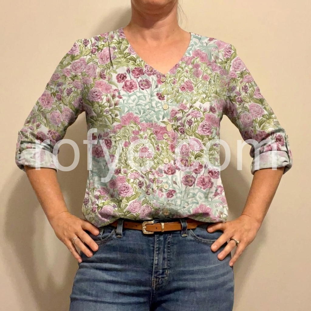 This long-sleeve top features a delicate pink rose pattern on a light background. The V-neck and button-down front add a classic touch. Lightweight fabric perfect for casual wear. Pair with jeans or skirts for a charming look. Ideal for spring and summer days.