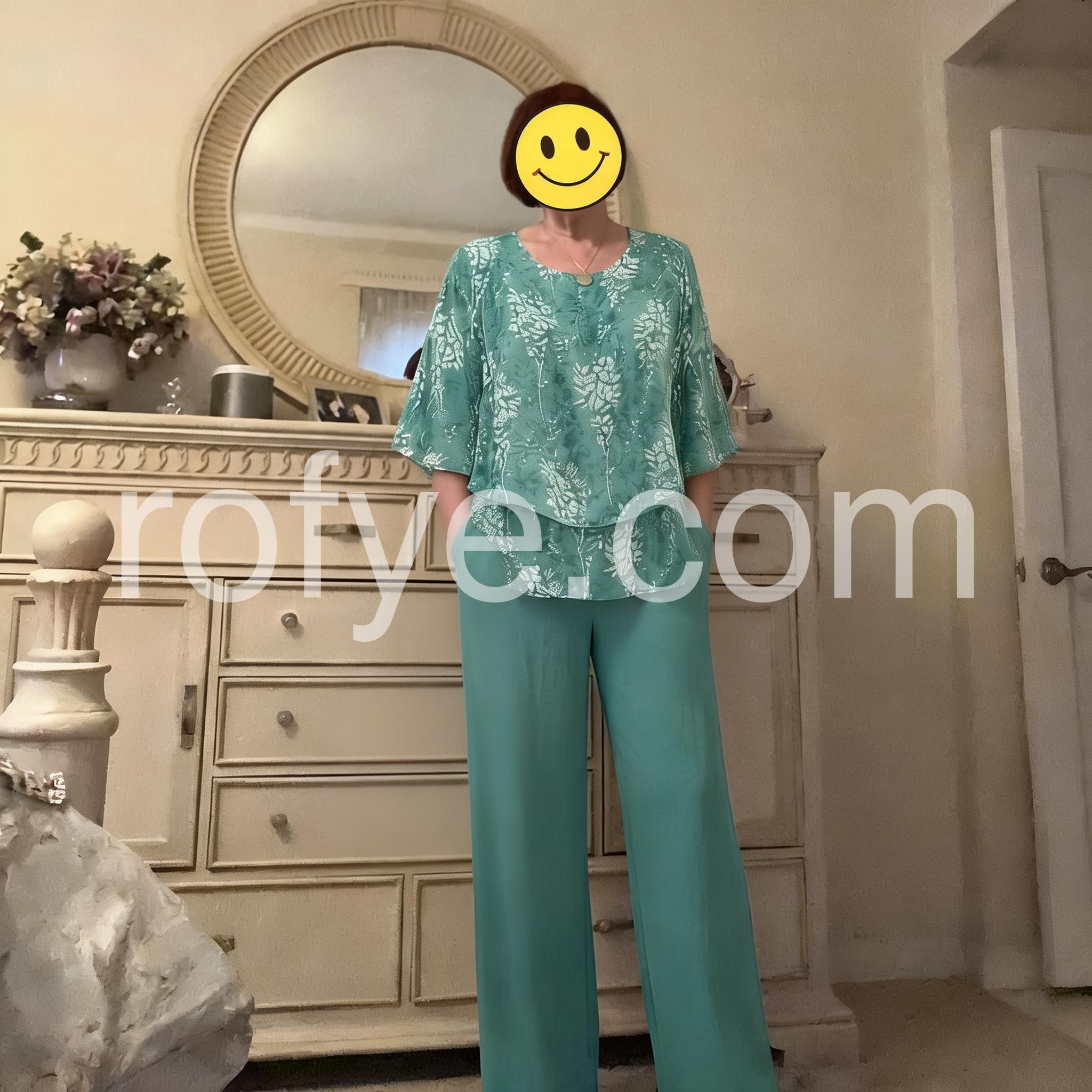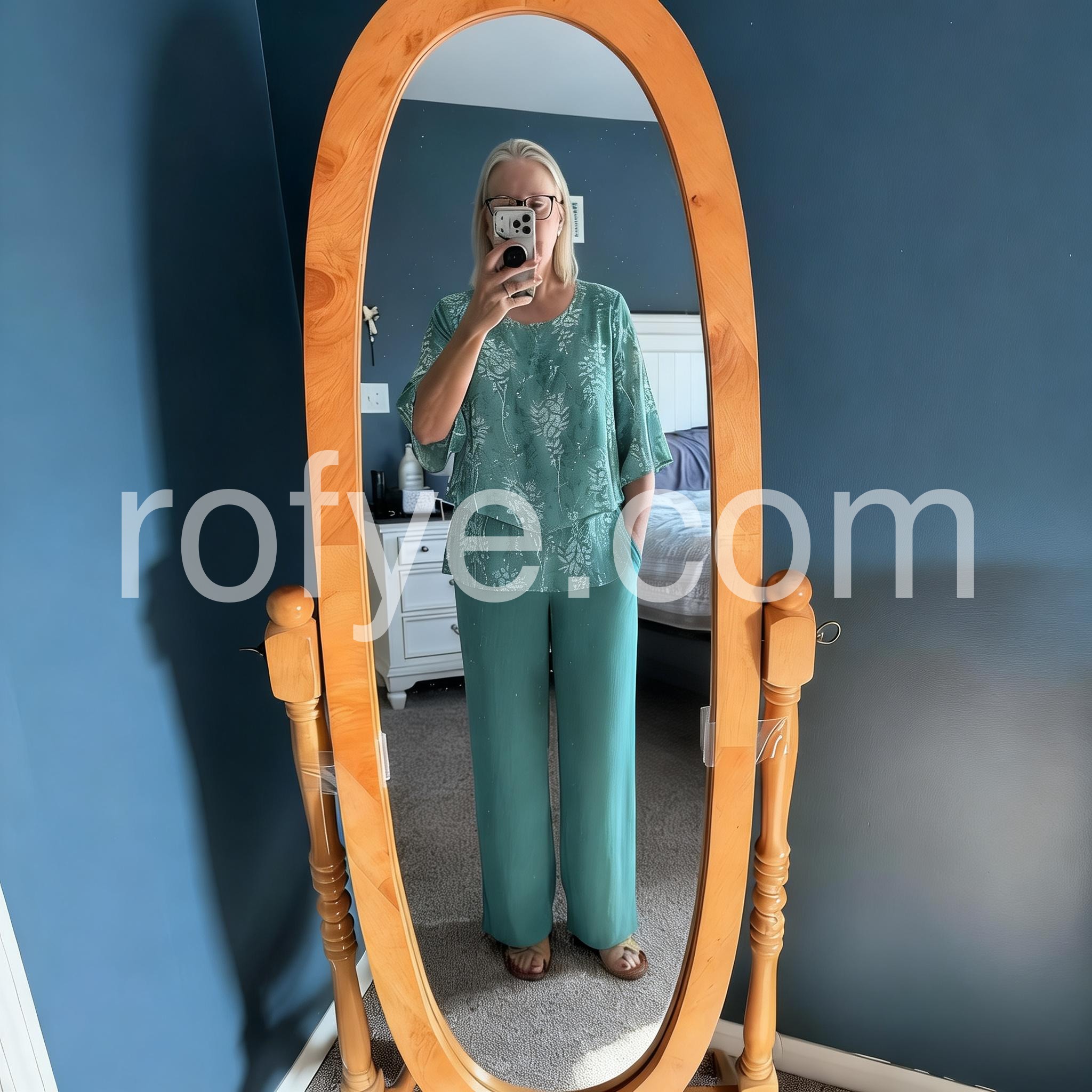 This coordinated two-piece set features a flowy floral-print top with flared sleeves and a layered hem. Paired with solid teal wide-leg pants for a relaxed silhouette. Lightweight fabric perfect for warm days. Ideal for casual outings or everyday wear. Elegant and effortless.